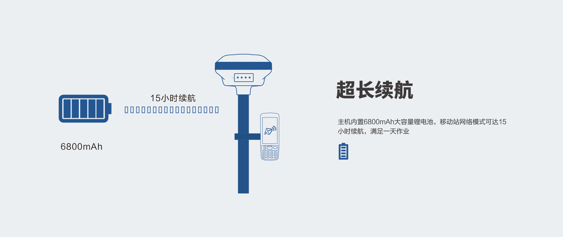內(nèi)置6800mAh鋰電池,支持移動(dòng)站15小時(shí)續(xù)航